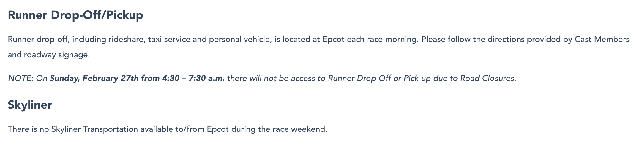 And, on Sunday from 4:30AM — 7:30AM, there will not be access to runner drop-off or pick up due to road closures. Also note that there is no Skyliner transportation to/from EPCOT during the race weekend.