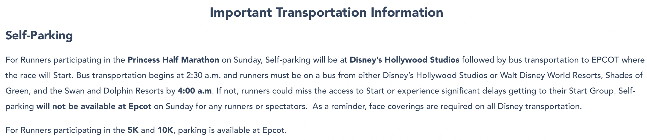 So, self-parking will not be available at EPCOT on Sunday for runners or spectators. This change only applies to the Half Marathon on Sunday, not the 5K or the 10K.