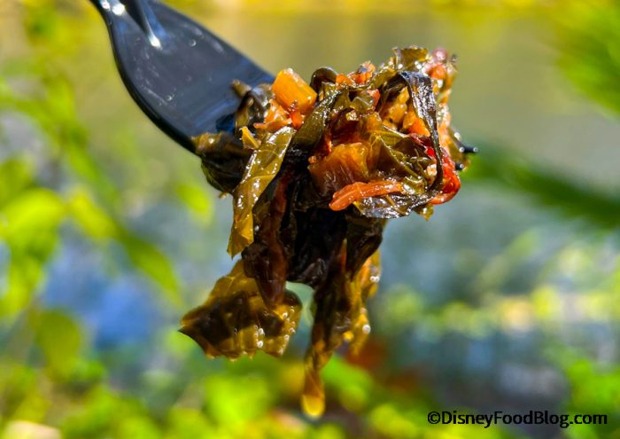 One of those food offerings is some classic side dish! It’s Collard Greens, which are tossed with Bacon (because bacon makes everything better, right?). And yes, we dove right on in. First up, we do have to admit this is NOT our Grandma’s collard greens, but Disney got pretty close here.