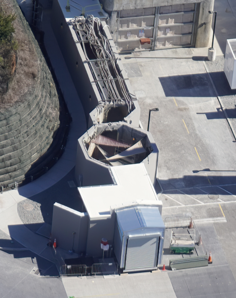 If we look closer, we can see that there’s a long transfer corridor from the shuttle into Galaxy’s edge that is mostly open air, with things dangling down from the top of the structure.