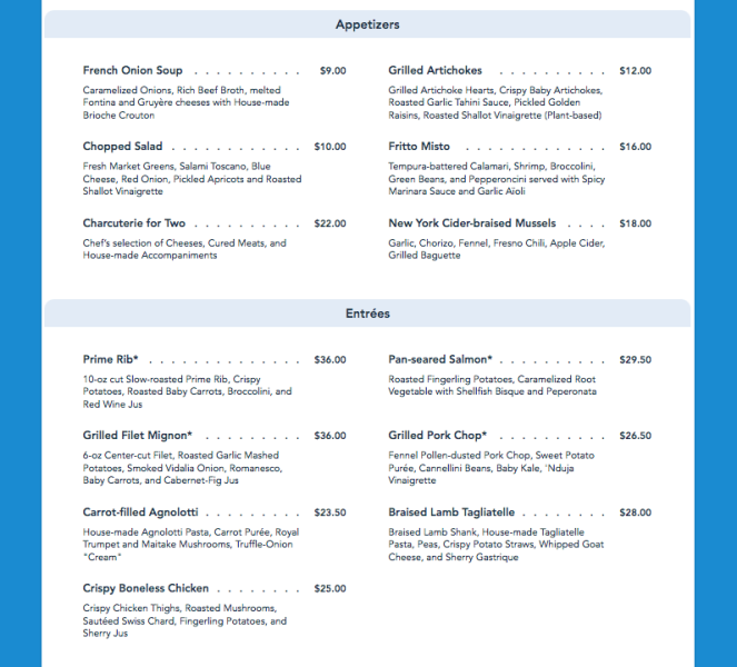 There are a variety of appetizers available, including french onion soup and the new New York Cider-braised Mussels appetizer. There are also a few different entrees available, whether you’re looking for fish, steak, or chicken.