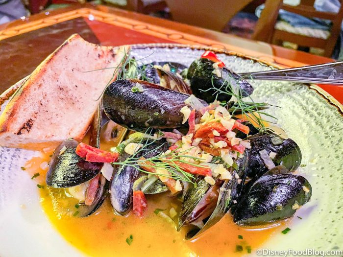 For our appetizer, we chose the new New York Cider-Braised Mussels for $18. The dish is made with Garlic, Chorizo, Fennel, Fresno Chili, Apple Cider, and served with a Grilled Baguette. Mussels in Disney World? You mean we’re not eating churros for dinner? Nope. Today, we eat MUSSELS.