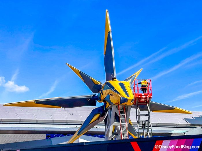 Construction continues on Guardians of the Galaxy: Cosmic Rewind in World Discovery! We recently saw the Nova Corps space ship be put up in front of the ride building, and when we went by the other day there was a ladder coming out of the ship.