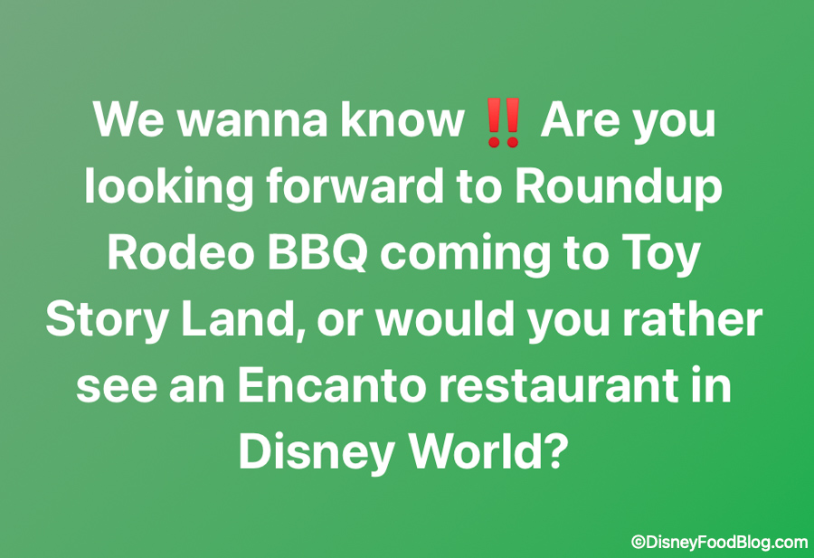 One person said they were “excited” for Roundup Rodeo BBQ, but “would rather Encanto. It’d have much better food choices,” which we think is a good point. The reason we even asked the question, to begin with, is because there is a decent amount of BBQ in Disney World already, especially with Regal Eagle Smokehouse only opening about 2 years ago.