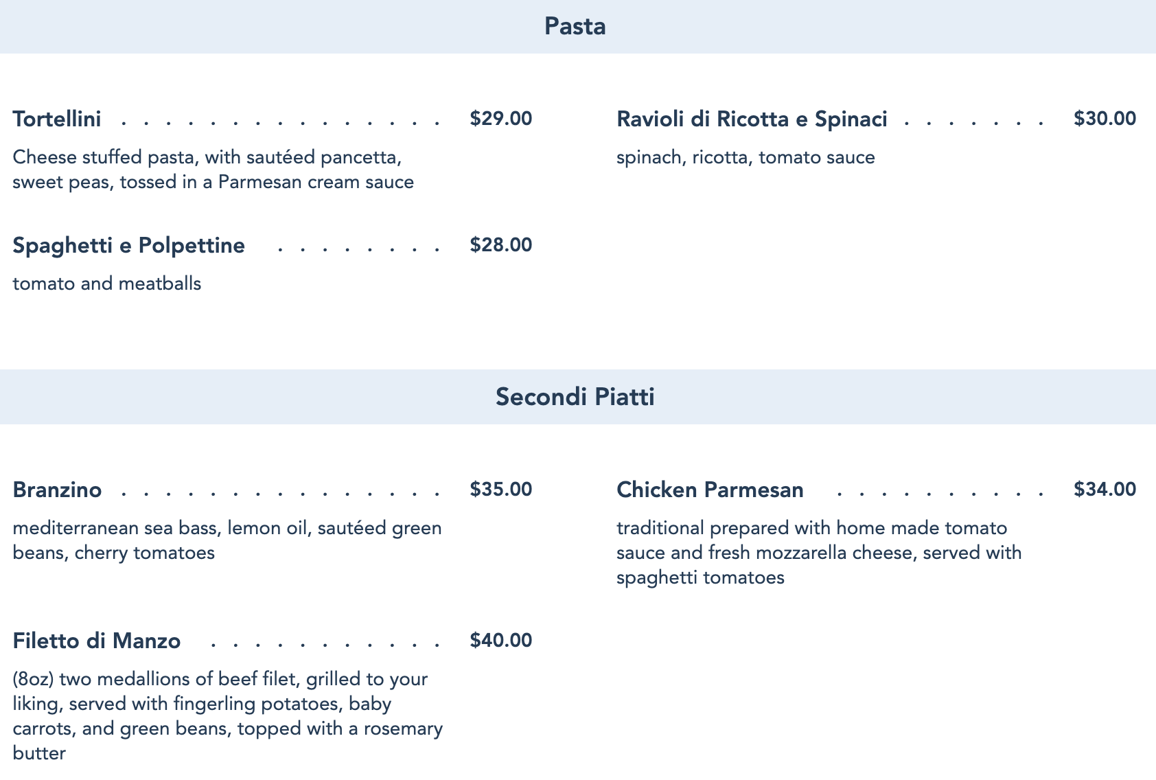 - You’re not a pizza & pasta fan. This one might seem obvious but the menu here is fairly limited. If you don’t love pizza & pasta, there won’t be too many other options here — though there is a chicken parmesan, a beef fillet, and a sea bass. Still, we highly recommend you review the menu to make sure everyone in your party can find something there to enjoy.