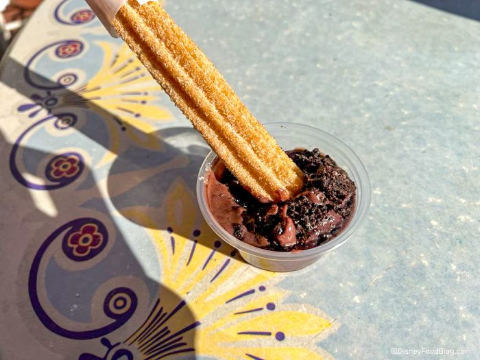 At select Disneyland churro stands, you can find a new Blueberry Chocolate Dipping Sauce for $1.00! This dip features a Chocolate Sauce with Blueberries and Chocolate Cookie Crumbles on top that makes for a smooth but thick sauce to go with your fresh churro.