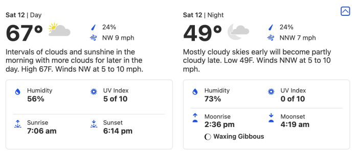By now, you can probably get a pretty good sense of what to expect on Saturday, February 12th! There’s a 24% chance of precipitation all day, winds at around 5-10 miles per hour, and humidity in the high 50 to low 70% range. You know, the same old! By this point in your vacation, you’ll probably be used to this weather.