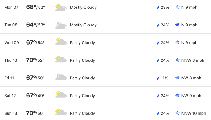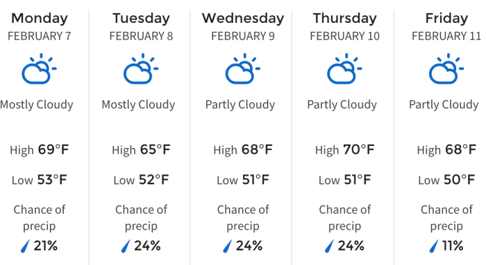 Finally, Sunday, February 13th ends the week with a high of 70° and a low in the evening of 50°. Look at those nice round numbers!