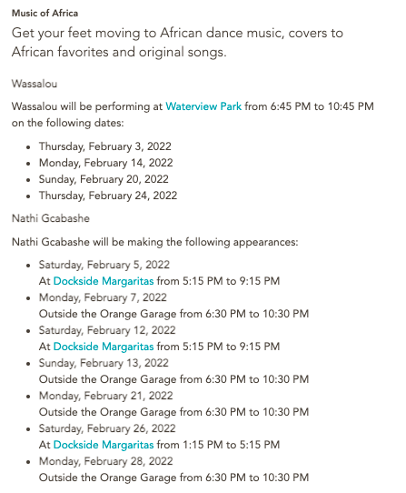 There will be seven different musical acts performing at Disney Springs for Celebrate Soulfully, and they’re listed in four different categories: Smooth Sounds, Jazzin’ It Up, Music of Africa, and Reggae! Here are the schedules for live music!
