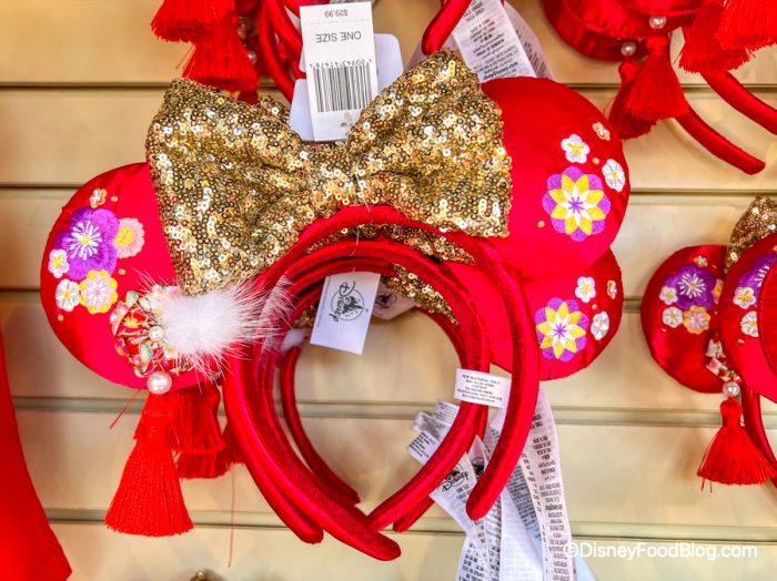 We found the Lunar New Year Minnie ears at the festival merch stand for $29.99.