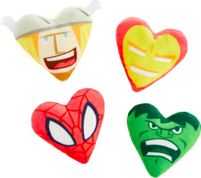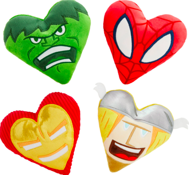 And for more heart-shaped Marvel fun, there’s a set of four plush hearts that look like the Avengers! There’s a squeaky toy heart for the Hulk, Spider-Man, Iron Man, and Thor.