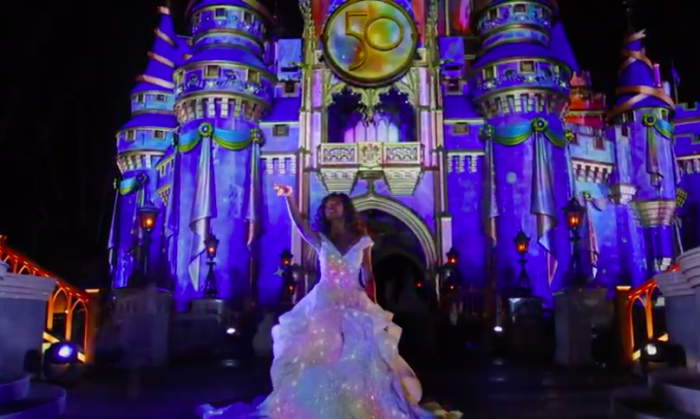 Blue, pink, and gold lights were projected onto the dress, which matched the 50th Anniversary decorations throughout the Disney World parks.