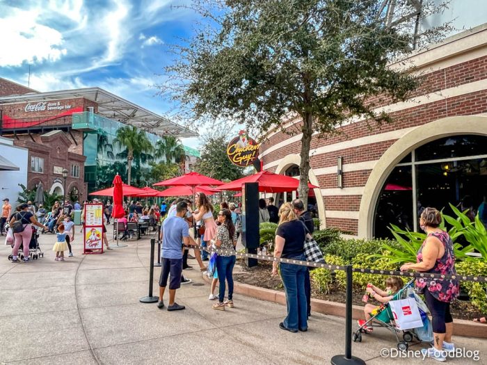 If you’re finding that the dining room and outdoor tables are packed, you can always get your food to-go and take it to the covered area nearby (the one to the left if you’re exiting Chicken Guy! where there are a number of stores to look at and ledges for sitting). In better weather, you can also take your food to-go and find another open area in Disney Springs to sit at — perhaps a spot closer to the water, a fountain, or just in a quieter area.