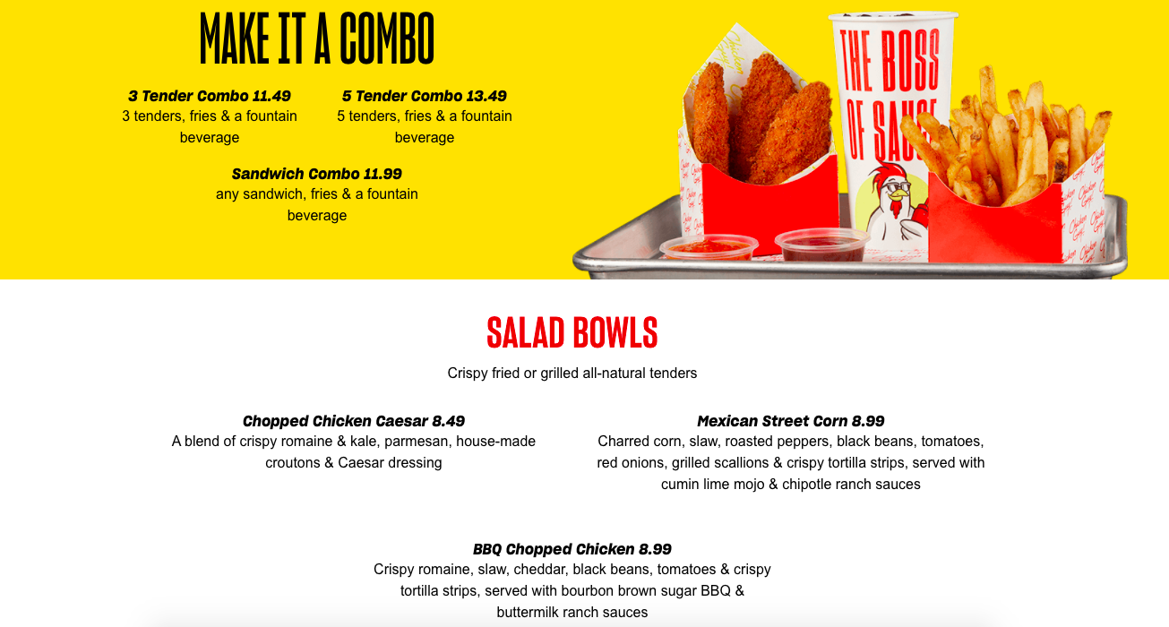 You can add fries and a drink to your meal by making it a combo. The combos come with 3 tenders, 5 tenders, or a sandwich, along with fries and a drink. There are also a few options for salad bowls…
