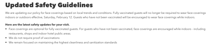 It notes the change in rules for vaccinated vs. unvaccinated guests, and also shares that proof of vaccination will not be required.