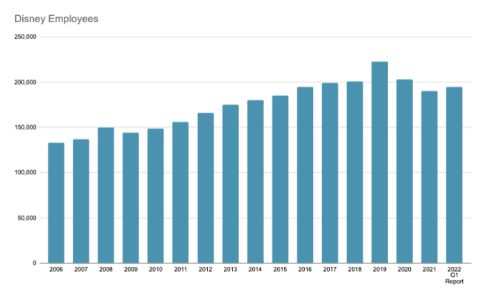 For perspective, here’s a look at the number of employees Disney has employed over the last several years: