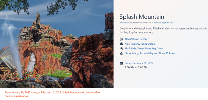 Expedition Everest is currently undergoing a lengthy refurbishment in Animal Kingdom and won’t be reopening until April. Splash Mountain has also been closed as scheduled maintenance is performed. It shut down in early January and is supposed to be reopening today, but the status of the ride is up in the air.