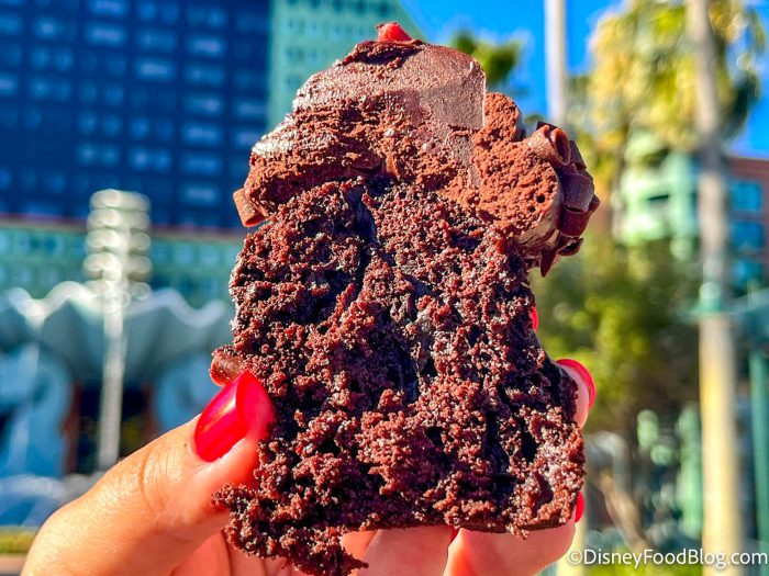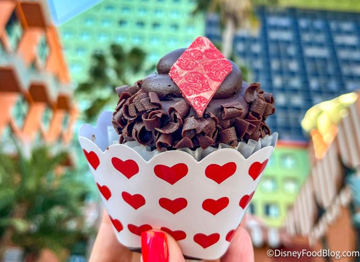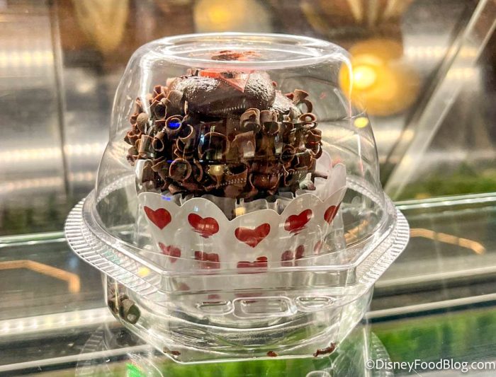 We’ve tried a pink Sweetheart Cupcake, a Sweetheart Sundae made with red velvet Mickey and Minnie waffles, and even a selection of marshmallow and chocolate goodies. We just found a cupcake that’s NOT red or pink, but it’s got a whole lot of chocolatey goodness.