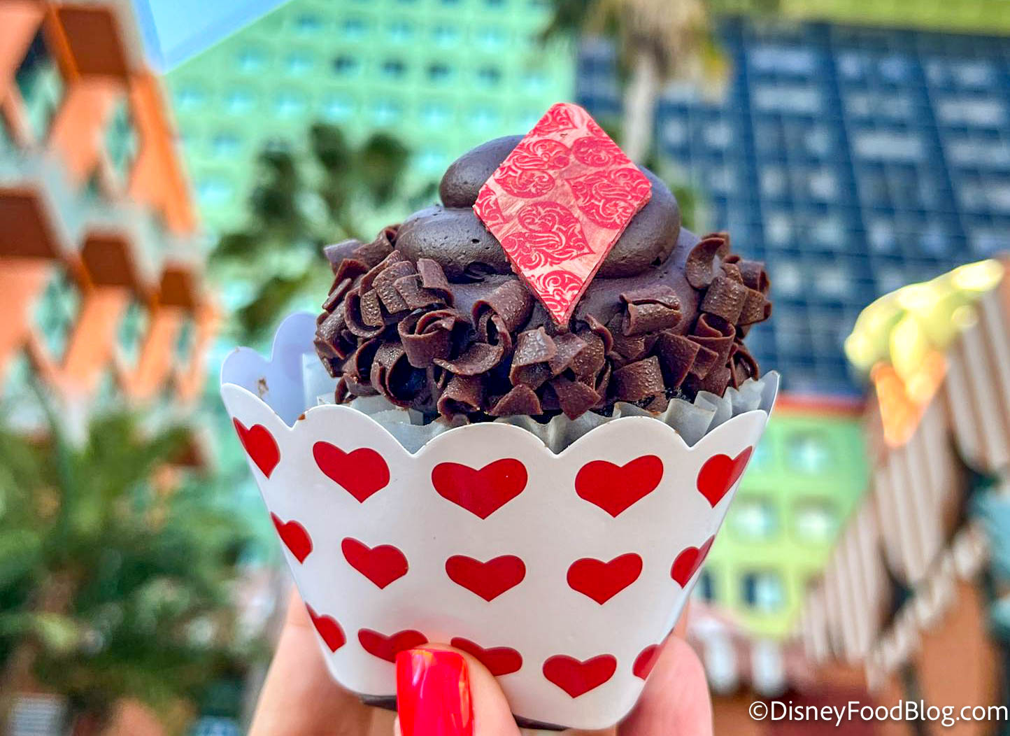 The Swan and Dolphin Hotels, located within walking distance to EPCOT and Disney’s Hollywood Studios, are true hidden gems in Disney World, and we found this Chocolate Valentine’s Day Cupcake at Fuel in the Dolphin Hotel. This grab-and-go market usually has sandwiches, snacks, coffee, and, of course, cupcakes.
