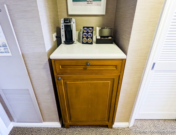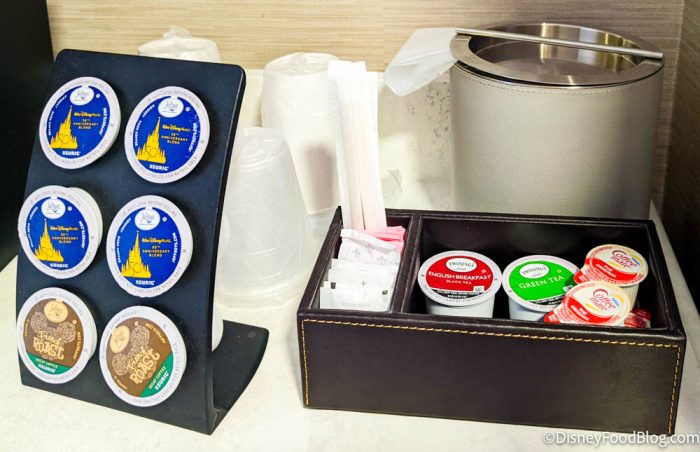 You’ll also find sugars and cream, as well as an ice bucket and some individually wrapped cups (for both hot and cold drinks).
