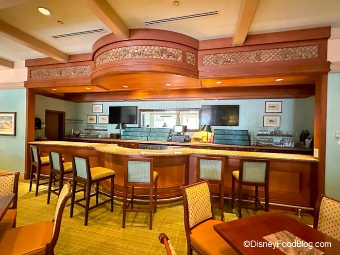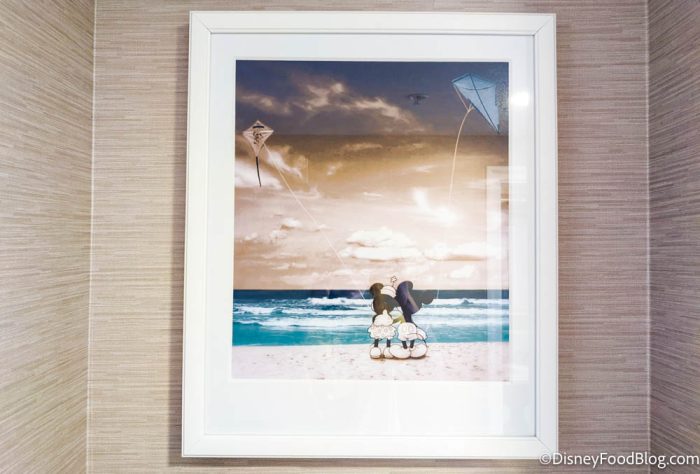 Above the bar, there’s an adorable picture of Mickey and Minnie flying kites together on the beach!