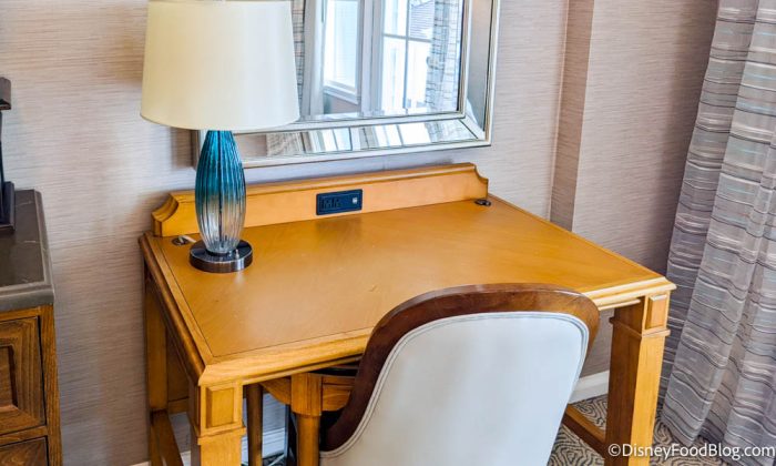 Beside the dresser, there’s a desk with a lamp and more outlets.