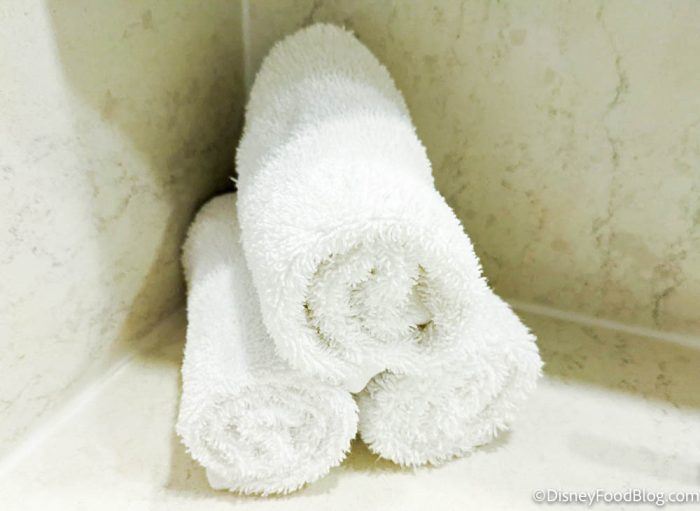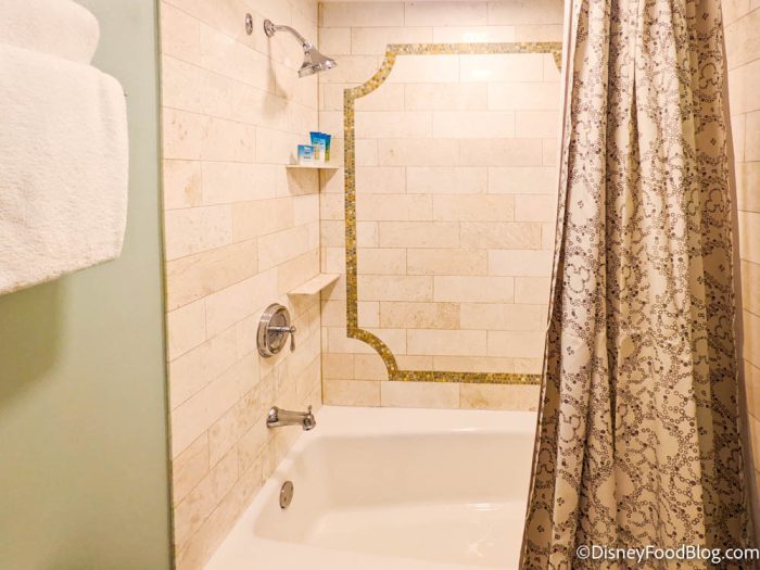 …and a shower/tub combo. Four towels are hanging up in this room, and don’t forget the extras that we found under the sinks.