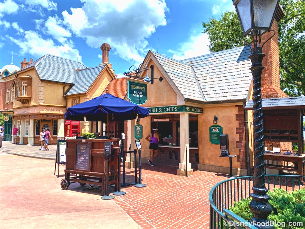 Back at the UK pavilion, the Yorkshire County Fish Shop is serving up Fish and Chips at its quick-service location. You won’t need reservations here, and there’s a large outdoor seating area right on the Lagoon.