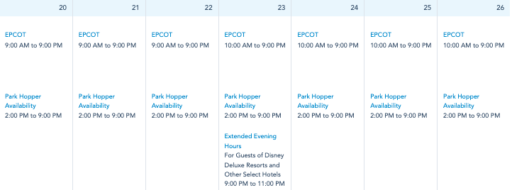EPCOT will be open from 9AM to 9PM on the 20th, 21st, and 22nd, and from 10AM to 9PM on the 23rd, 24th, 25th, and 26th. There will be Extended Evening Hours on the 23rd from 9PM to 11PM.