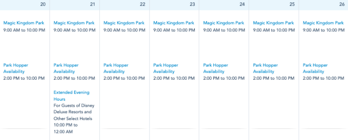 Magic Kingdom will be open from 9AM to 10PM every day next week (from February 20th through the 26th), with Extended Evening Hours for Deluxe and Deluxe Villas Guests on the 21st from 10PM to 12AM.