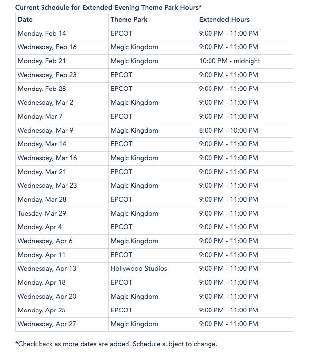 Extended Evening Hours are only available on select nights at select parks, so there’s a schedule on the Disney World website that guests can check out. Up until now, these “bonus hours” have only been available at Magic Kingdom and EPCOT, but recently we noticed that they’d be offered at Hollywood Studios on April 13th.