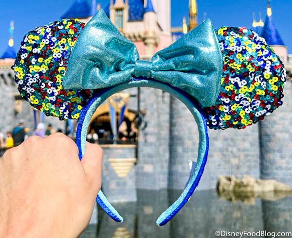 The gorgeous new design is highlighted with a shimmery blue bow in front of sequined ears. And those sequins remind us a little bit of New Year’s confetti with all the different colors that blend together — they almost look like something you’d wear to a birthday party!