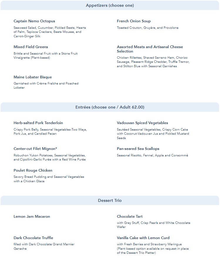 We visited Be Our Guest for lunch this time so let’s take a look at the lunch menu! Again, keep in mind that the prix fixe option is the same at lunch and dinner. You choose one Appetizer, one Entrée, and either the Dessert Trio or a plant-based option for a price of $62 per adult.