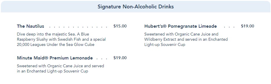 There are a few Signature Non-Alcoholic Drinks available, like The Nautilus, a specialty cocktail for the 50th Anniversary.