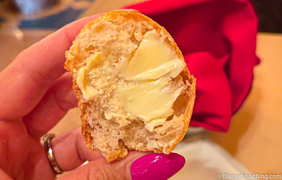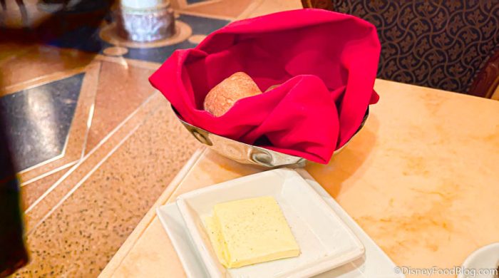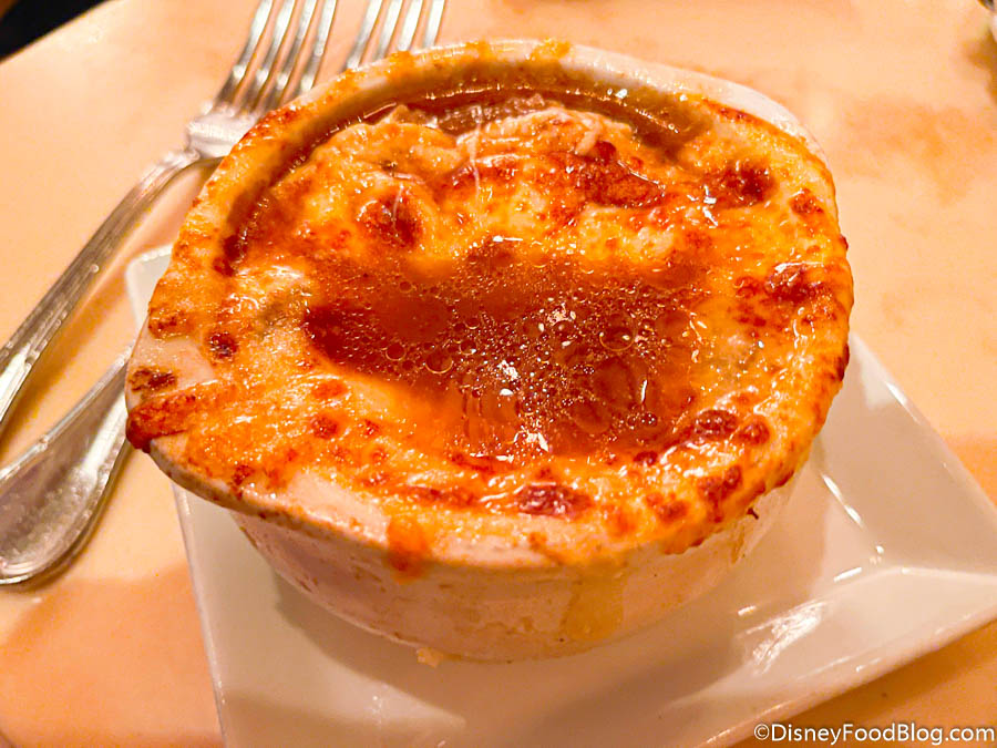This soup was VERY good. It’s one we’ve truly enjoyed in the past, so there’s no big shocker there. It had a lot of melty cheeeeeeese that made it flavorful without being too heavy before a big meal. We do wish it would have had more onions though (it is french ONION soup after all?). We also think that this soup isn’t quite as rich as some other Disney World French Onion Soups (like the ones over at Steakhouse 71 or Yachtsman Steakhouse), but it did set the meal up nicely.