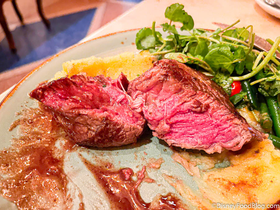BUT we (personally) don’t think it was as good as some of the other awesome steak options we’ve had at places like Space 220 or Le Cellier (both in EPCOT). We also wish there were more of the green beans to help balance things out.