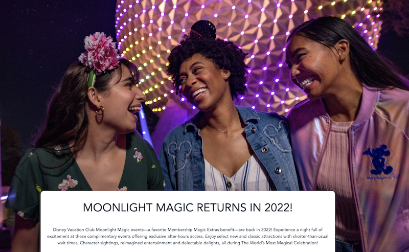 Moonlight Magic events are special Disney Vacation Club (DVC) perks, and they’re finally coming back! Disney has announced the return of Moonlight Magic in EPCOT, Disney’s Hollywood Studios, and Disney’s Animal Kingdom. During these events, DVC Members can enjoy shorter wait times, special Disney character sightings, entertainment, and even complimentary treats.