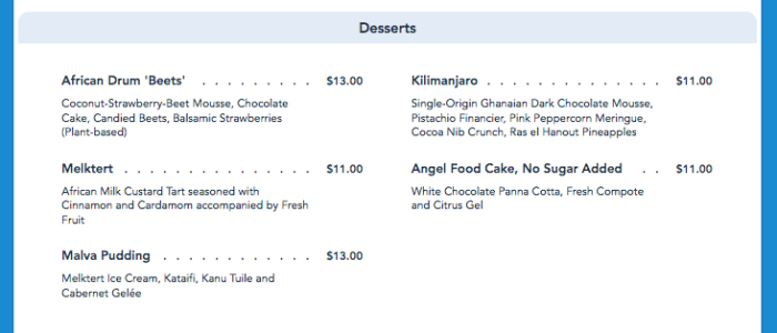 On the entrée menu, you’ll find a variety of meat, seafood, and plant-based options. Keep in mind that the entrées are priced along the lines of a signature dining experience. In terms of options, guests can choose from things like the Moroccan Lamb Shank, Oak-grilled Filet Mignon, Heritage Chicken, Fish, and more! Guests can also add three additional enhancements that range in price from $11 to $23.