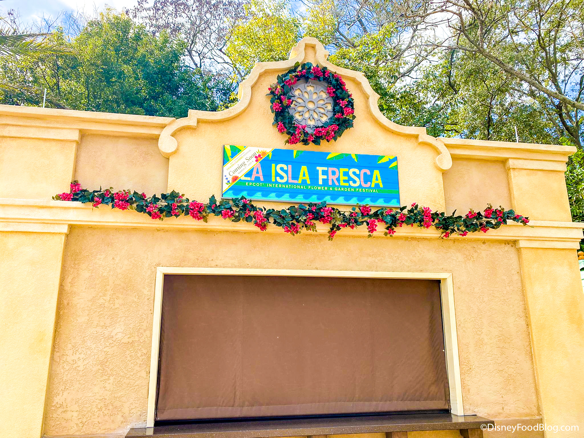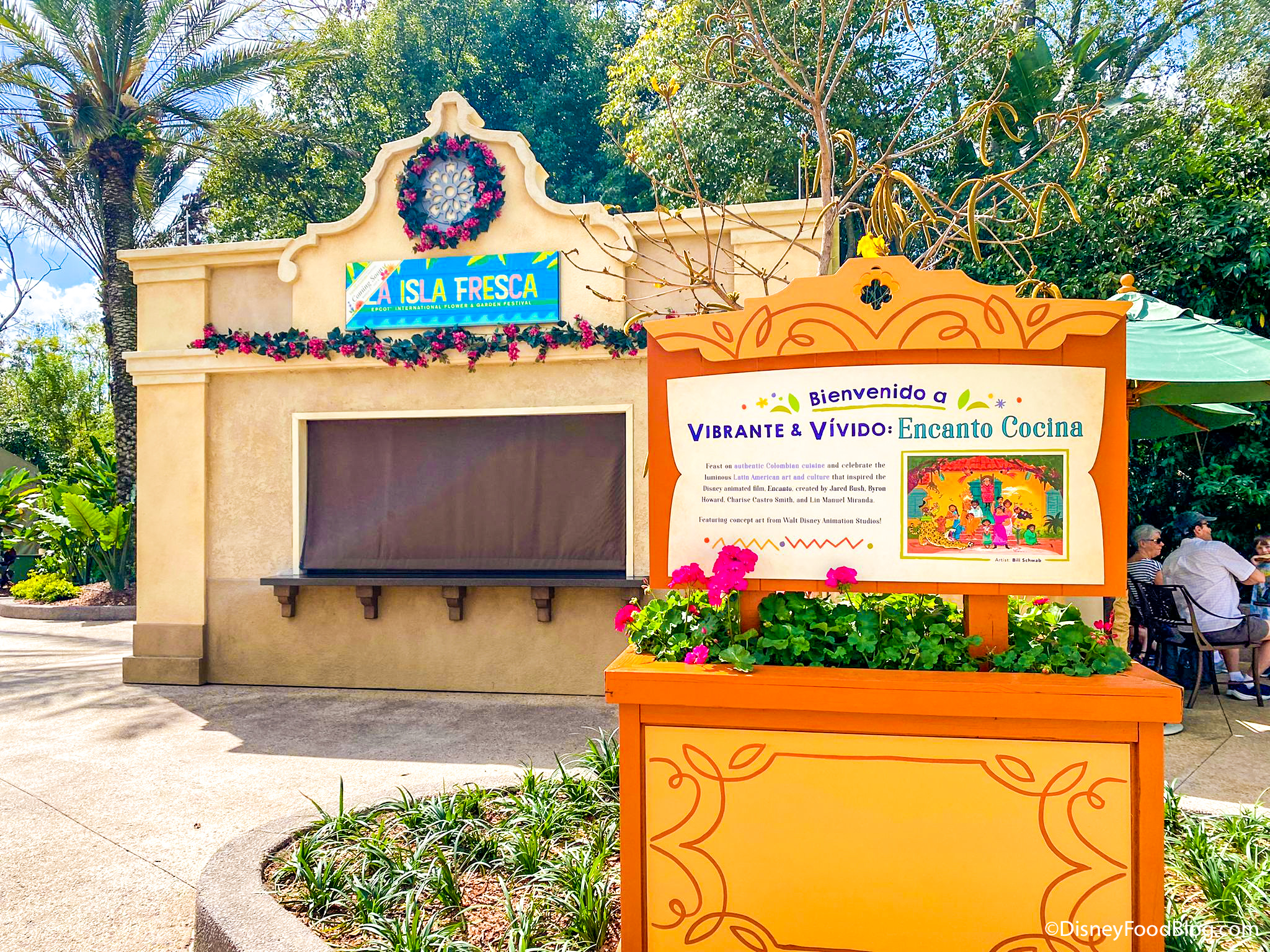 While strolling along the World Showcase today, we spotted a couple Flower and Garden Booths already! First, we found La Isla Fresca over between the Morocco and France pavilions. This was just the Vibrante & Vívido: Encanto Cocina booth for Festival of the Arts, so some of the signage is still up in the front!