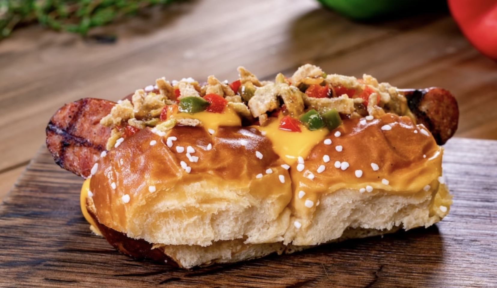 Over at California Craft Brews there will be a new IPA Sausage Dog on a soft pretzel roll with onion-pepper Jardinière, cheddar cheese sauce, and malt vinegar-jalapeño crunch!