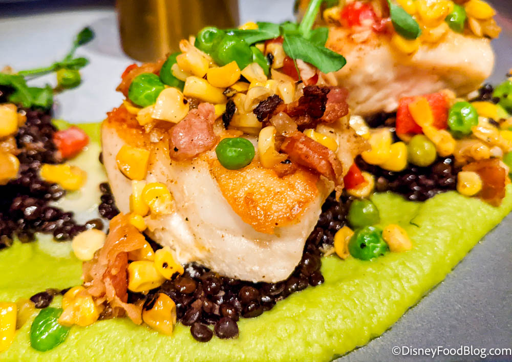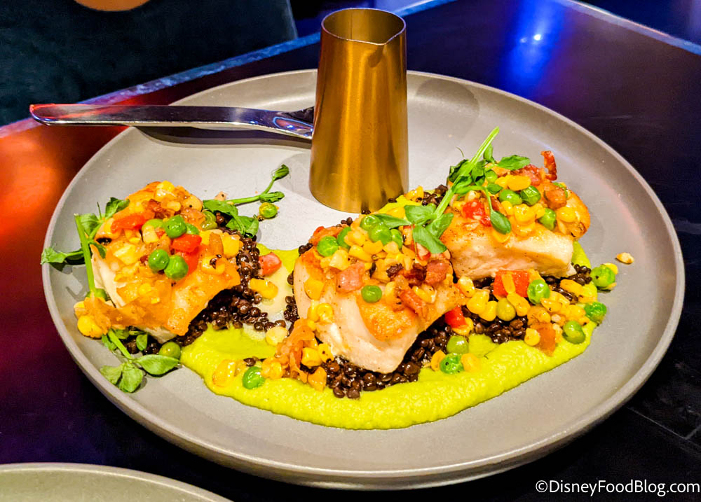 Next we had the Seared Kashyyyk Whitefish (fun fact: Kashyyyk is the home world of the wookiees!). This dish was served with greenpod puree, Jekka seed, cornseed relish, and yellowfruit buttercream. A quick aside, though you’ll notice this and other dishes have some of those Star Wars names, don’t let that scare you away! These are all usually just fun names for regular food Earthlings know and love!