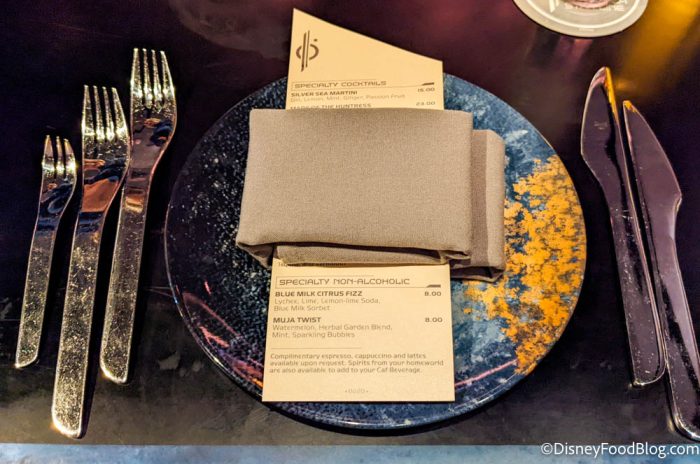 On your table you’ll find some cool-looking silverware and a beautiful plate, along with your napkin and the specialty drinks menu (note that specialty drinks are not included and will be an additional charge).