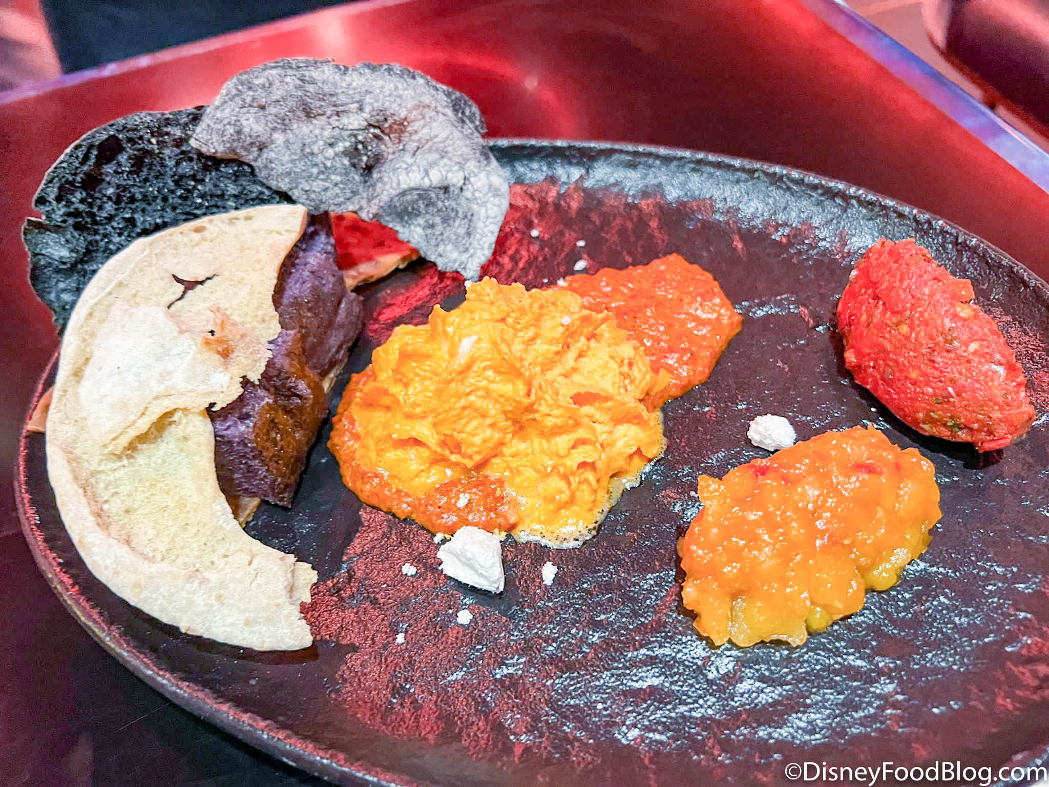 Our meal started off with a Mustafar-inspired bread service with various types of accompanying hummus and dips. (For those who may not know, Mustafar is a fiery planet known in the Star Wars universe for being the site of the epic battle between Anakin Skywalker and Obi-Wan Kenobi which ultimately leads to Anakin’s full turn into Darth Vader. The planet also later became home to a palace/central hub created by Darth Vader).