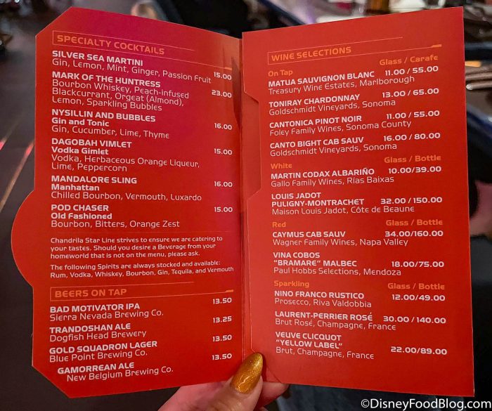 Also on the specialty cocktails menu for night 2 is the Dagobah Vimlet. This drink costs $15 and features vodka, herbaceous orange liqueur, lime, and peppercorn. Essentially, it’s a take on a vodka gimlet.