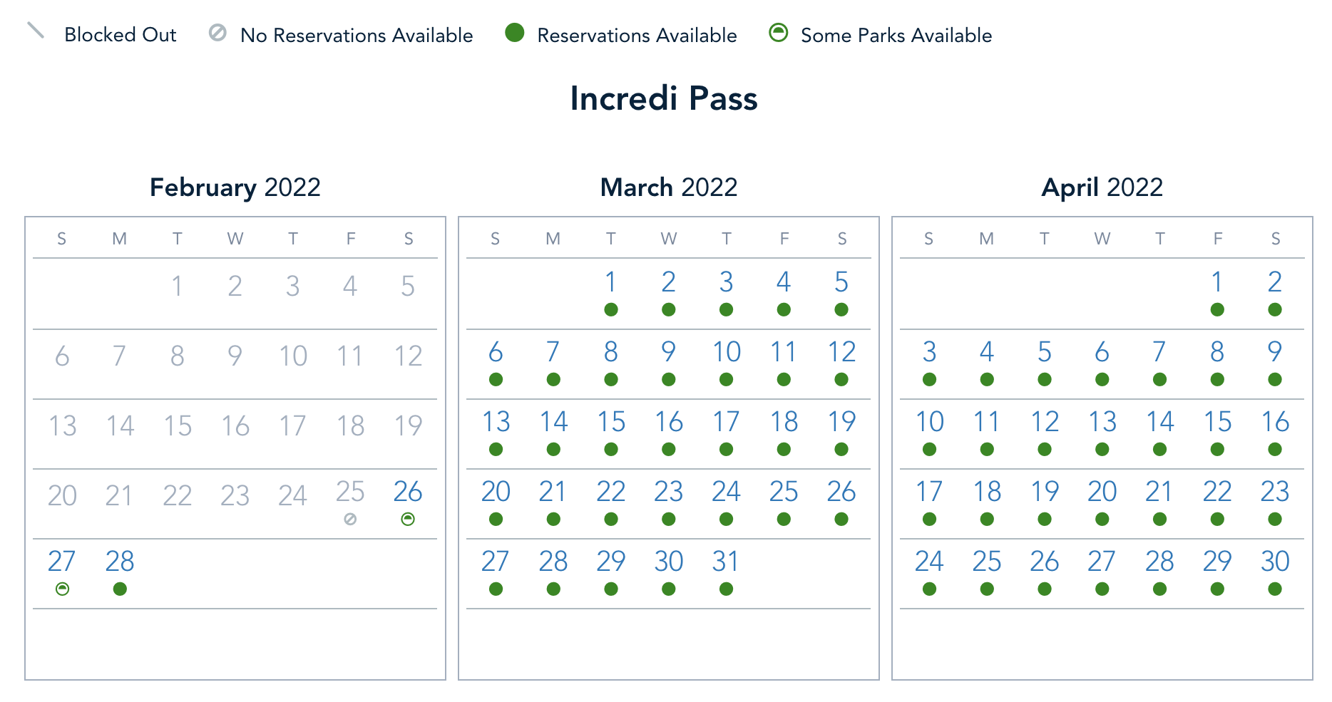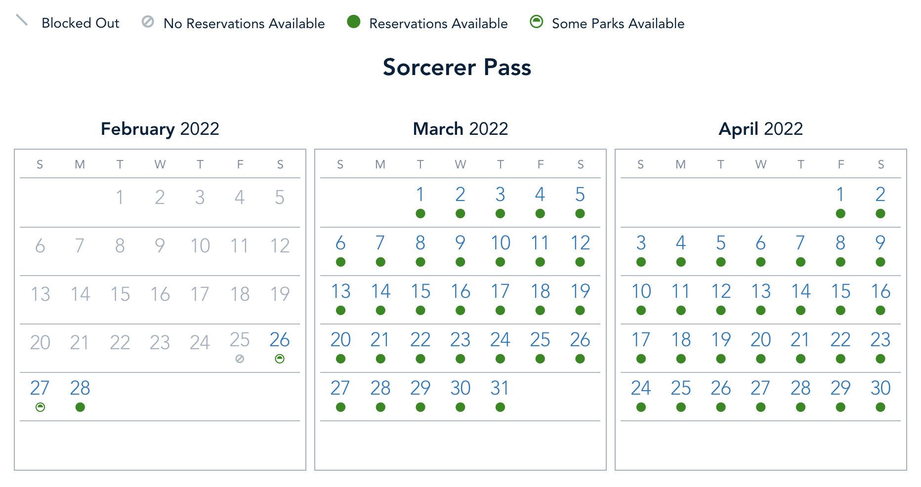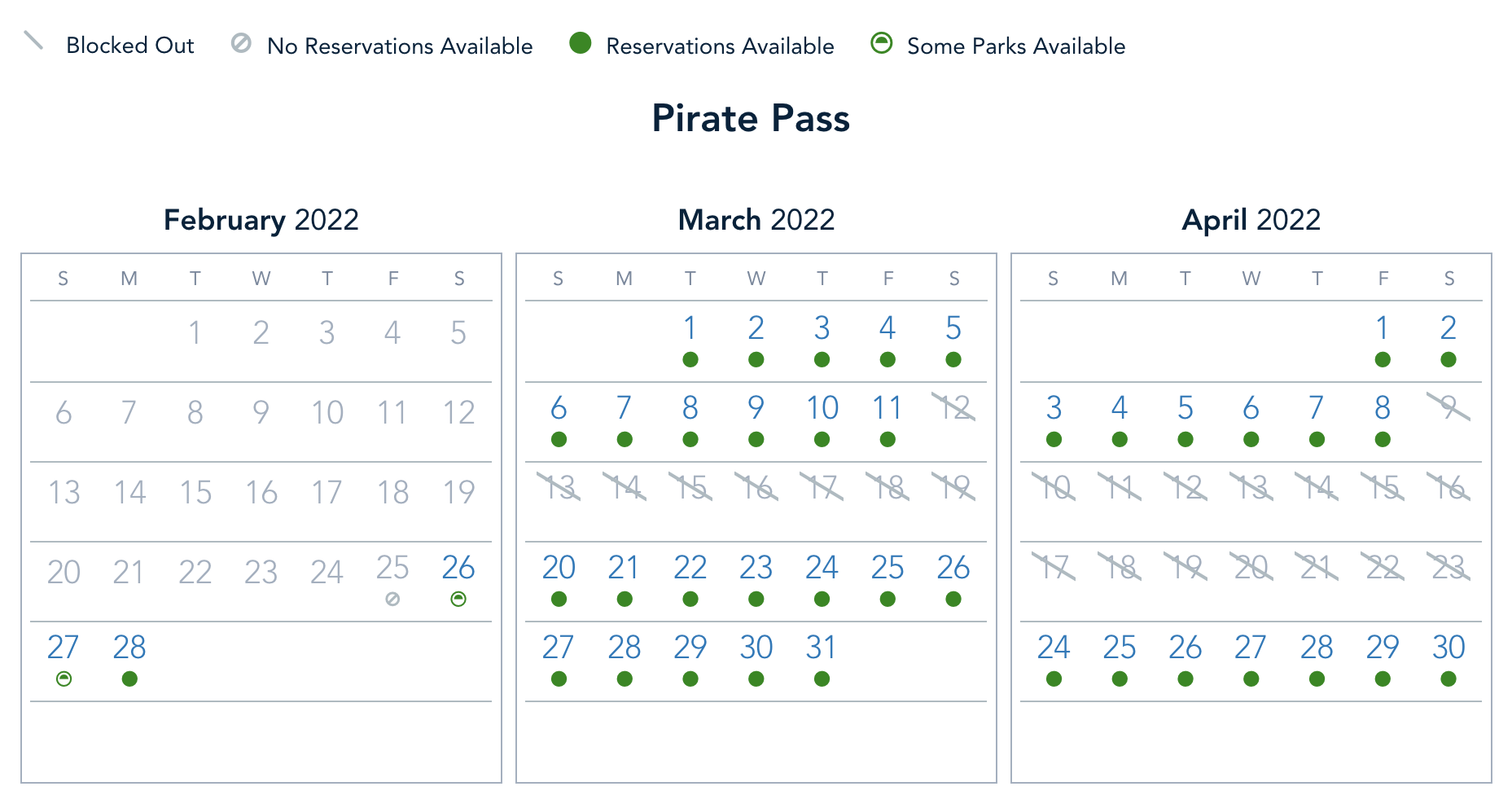 Pirate Pass holders have the same situation as both previous passholders, with full park availability from February 28th to March 5th, and limited availability on February 27th. Again, it looks like Magic Kingdom and Animal Kingdom are the parks busy on that date.