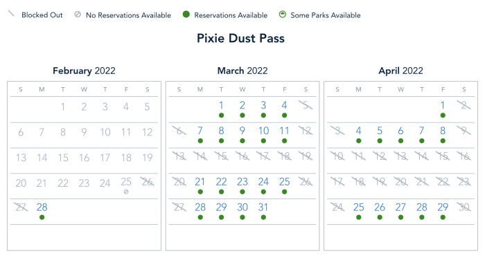 Pixie Dust Pass holders are blocked out on February 27th and March 5th, but reservations are open at all parks from February 28th through March 4th.