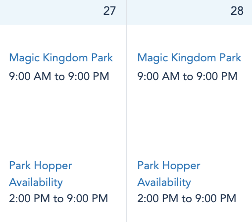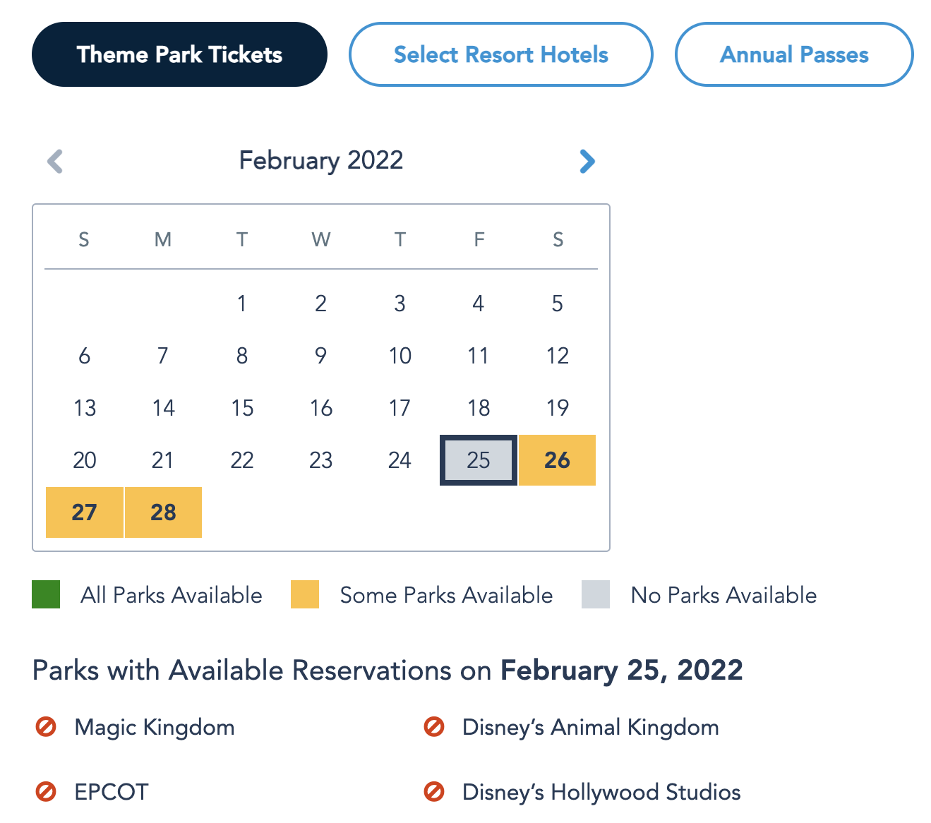If you have Theme Park Tickets, park pass availability is limited on February 27th and 28th. On the 27th, Magic Kingdom is unavailable, and on the 28th, only EPCOT is available.