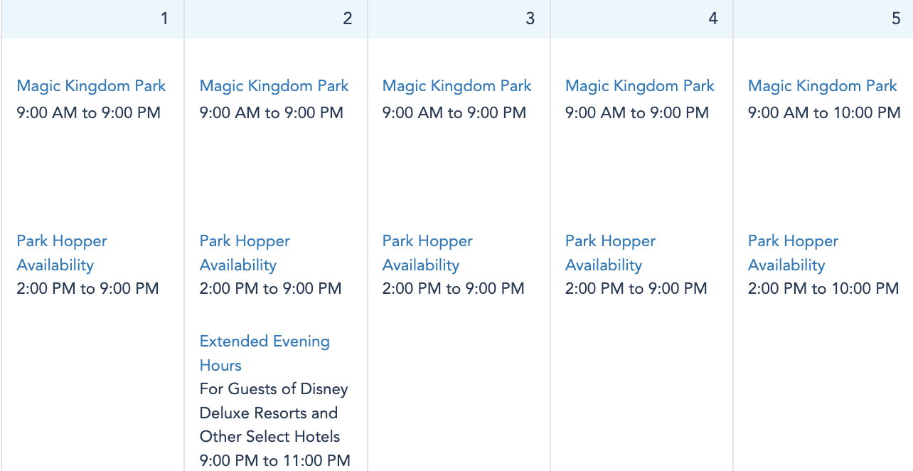 …and 9AM to 9PM from March 1st to the 4th, with Extended Evening Hours for Deluxe Resort hotel guests on March 2nd from 9PM to 11PM. On March 5th, Magic Kingdom will be open from 9AM to 10PM, so you get an extra hour that day!