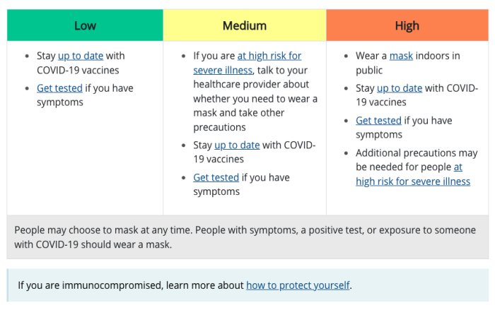 For counties in the “low” level, the CDC recommends that individuals wear a mask based on their personal preference. For counties in the “medium” level, the CDC recommends that individuals who are immunocompromised or those who live with or have social contact with someone who is at high risk for certain things take certain precautions, like potentially wearing a mask.