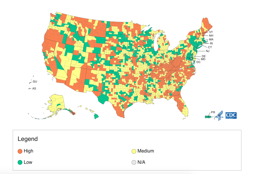 On that same CDC site, you can check to see the community level by state and county. Both Orange County, Florida…